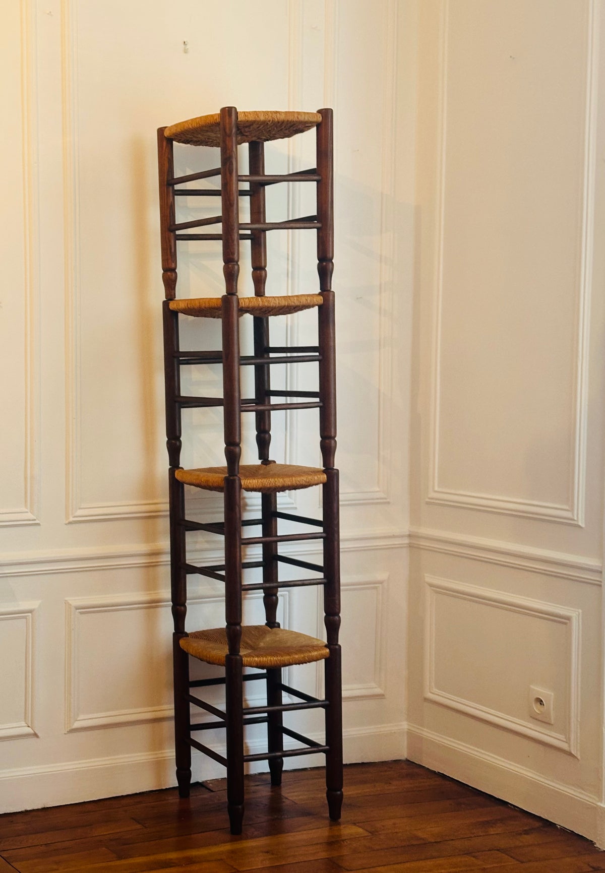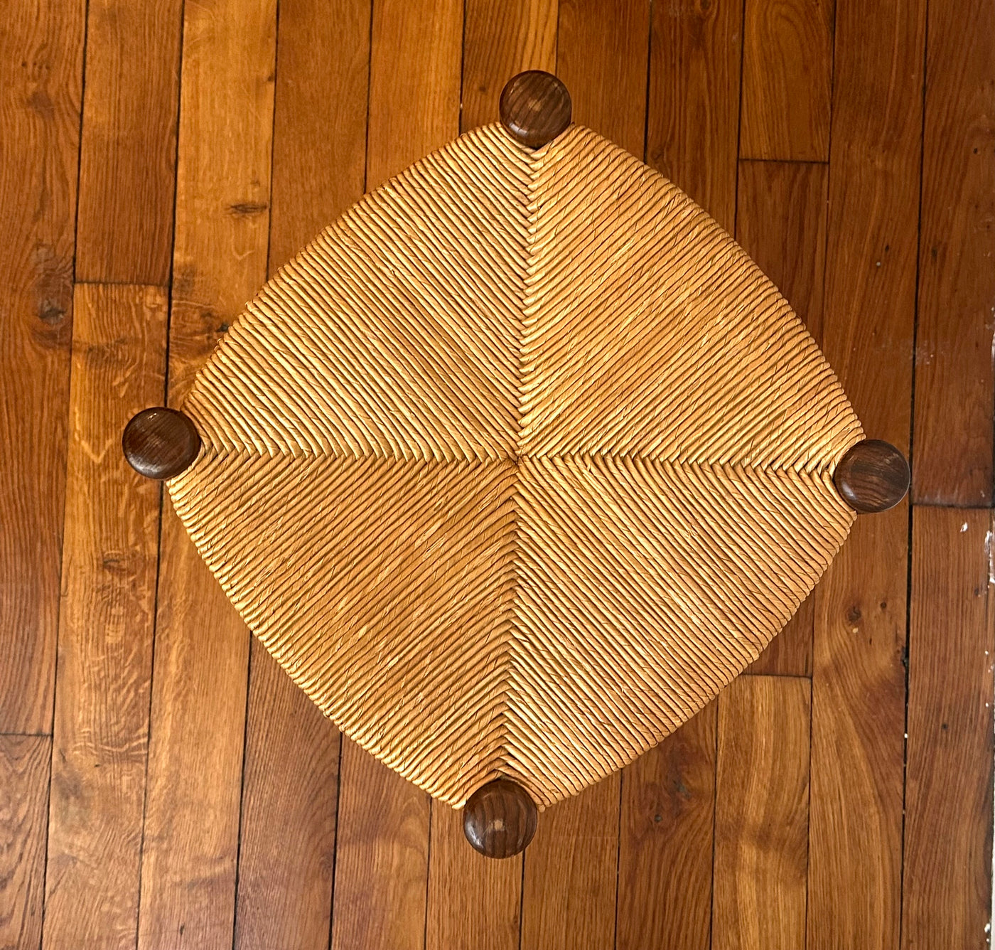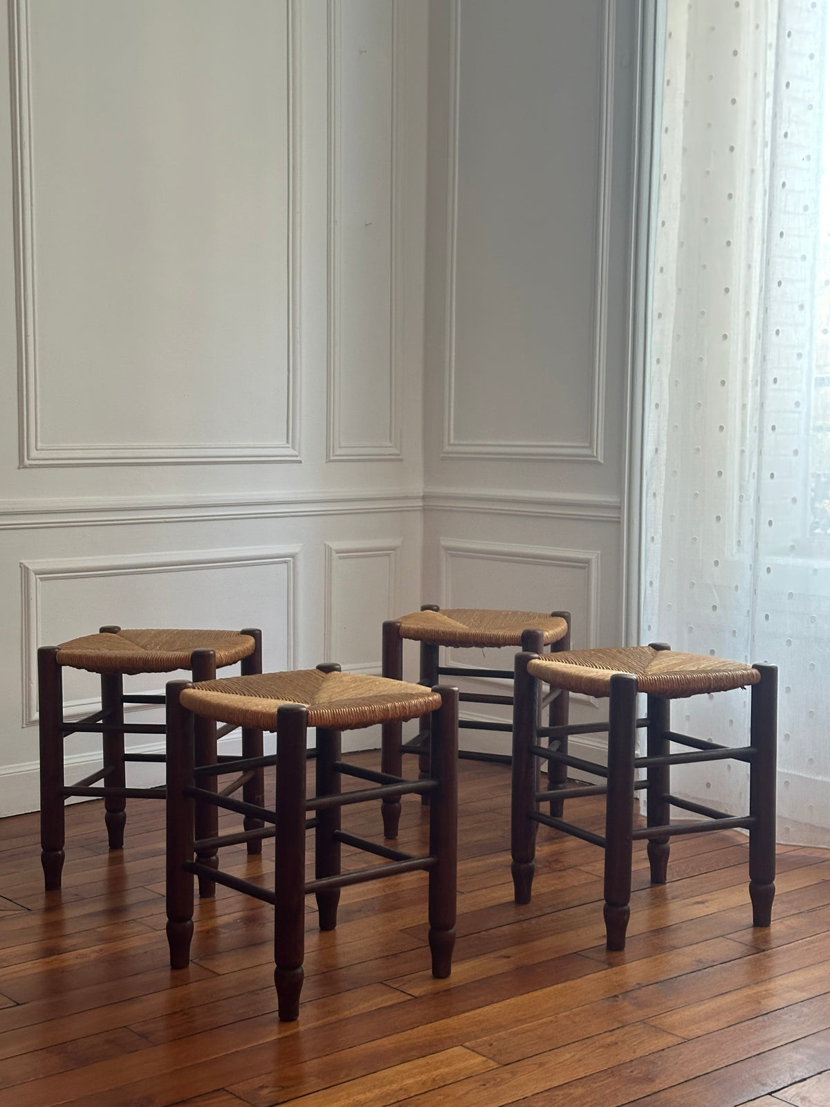 Série de 4 tabourets français en bois et paille tressée