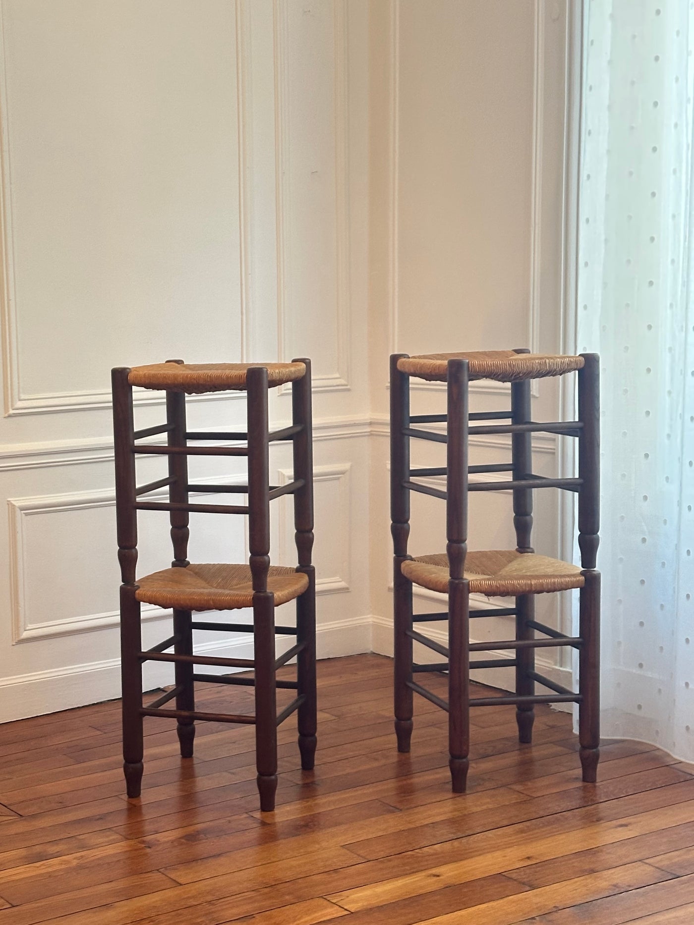 Chaque tabouret est en bois massif, dont la teinte chaude met en valeur la texture naturelle du matériau. L’assise, tressée à la main en paille de seigle, apporte une touche rustique et raffinée, typique du savoir-faire traditionnel français.