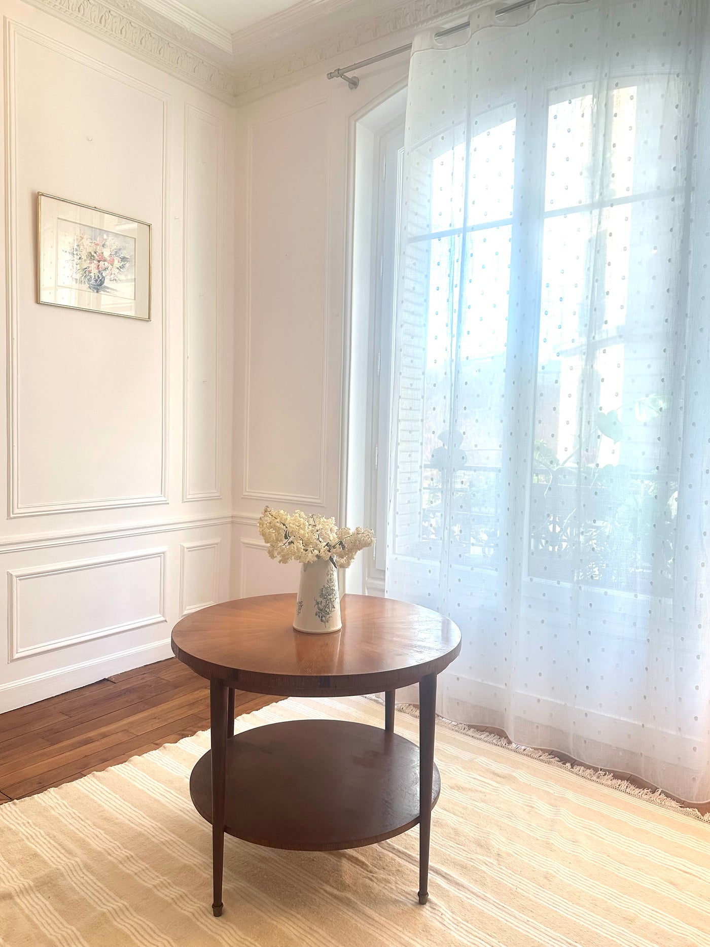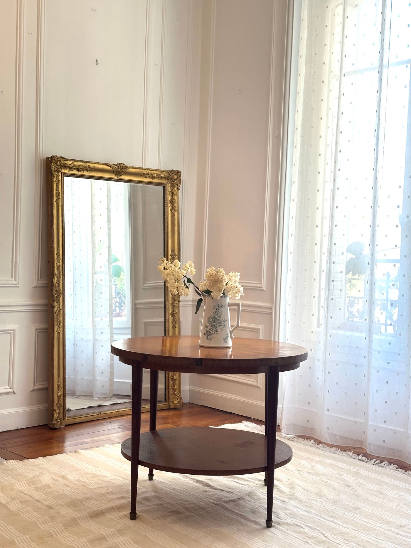 Cette table basse ancienne se distingue par son élégante forme ronde et son design raffiné qui mêle sobriété et caractère.